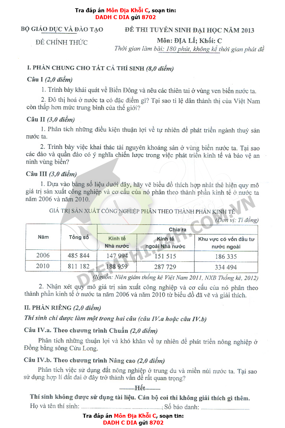 Đề thi đại học môn Địa lí khối C năm 2013: